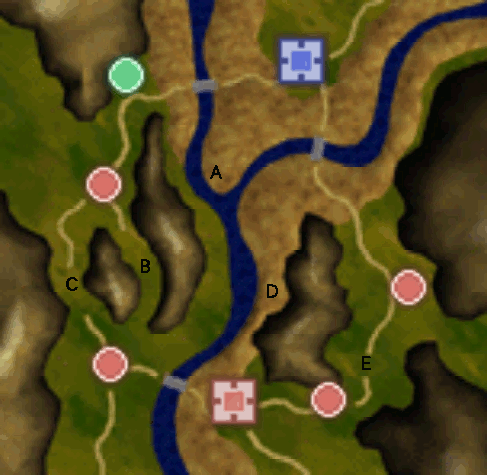 道が2手に分かれていますが、戦力を分けずに右ルートに集中して敵の本拠地を避けて下から左ルートの逃げ道を塞ぐほうがいい気がします。