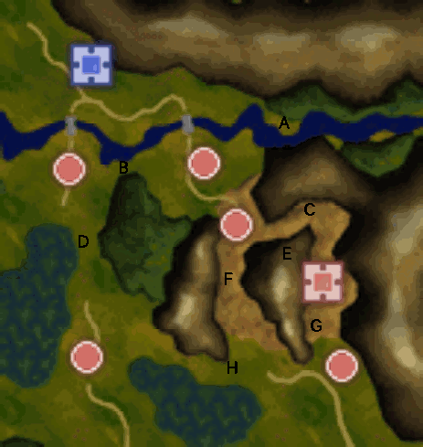 作戦会議でも言われますが、グンター採掘場に向かって直線的に進むと山に囲まれて移動しにくい上に敵が多いので、